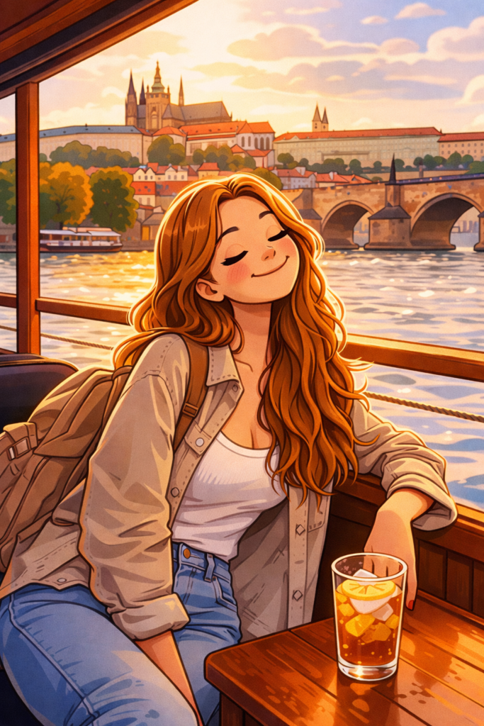 Sale a bordo di un piccolo battello per una gita sul fiume Moldava. La vista è spettacolare, palazzi storici si specchiano nell’acqua al ritmo della musica e della voce delle cuffiette date a bordo, che la guida alla scoperta di tutto ciò che la circonda in quel momento. Il tutto addolcito da un the e una brioche gentilmente offerti dal personale. Dopo 45 rilassanti e magici minuti torna sulla terra ferma, beve una bella sorsata d’acqua e decide di prendere il bus per il ritorno.